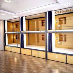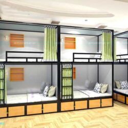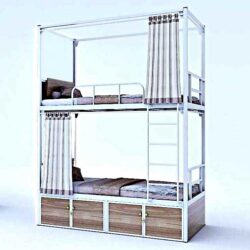 Giường tầng HomeStay được thiết kế theo không gian. Kích thước có thể tùy theo không gian và yêu cầu từ khách hàng. Giường được làm bằng hệ thống sắt sơn tĩnh điện với các hộp đựng đồ được quây kín  xung quanh. Mẫu giường tầng sắt kết hợp với gỗ này được dùng cho các khách sạn có quy mô vừa và nhỏ. Không những phù hợp với không gian mà còn tiết kiệm chi phí.