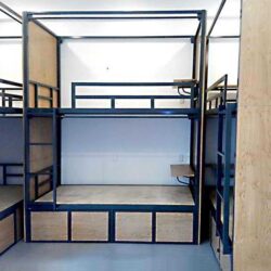 Giường tầng HomeStay được thiết kế theo không gian. Kích thước có thể tùy theo không gian và yêu cầu từ khách hàng. Giường được làm bằng hệ thống sắt sơn tĩnh điện với các hộp đựng đồ được quây kín  xung quanh. Mẫu giường tầng sắt kết hợp với gỗ này được dùng cho các khách sạn có quy mô vừa và nhỏ. Không những phù hợp với không gian mà còn tiết kiệm chi phí.